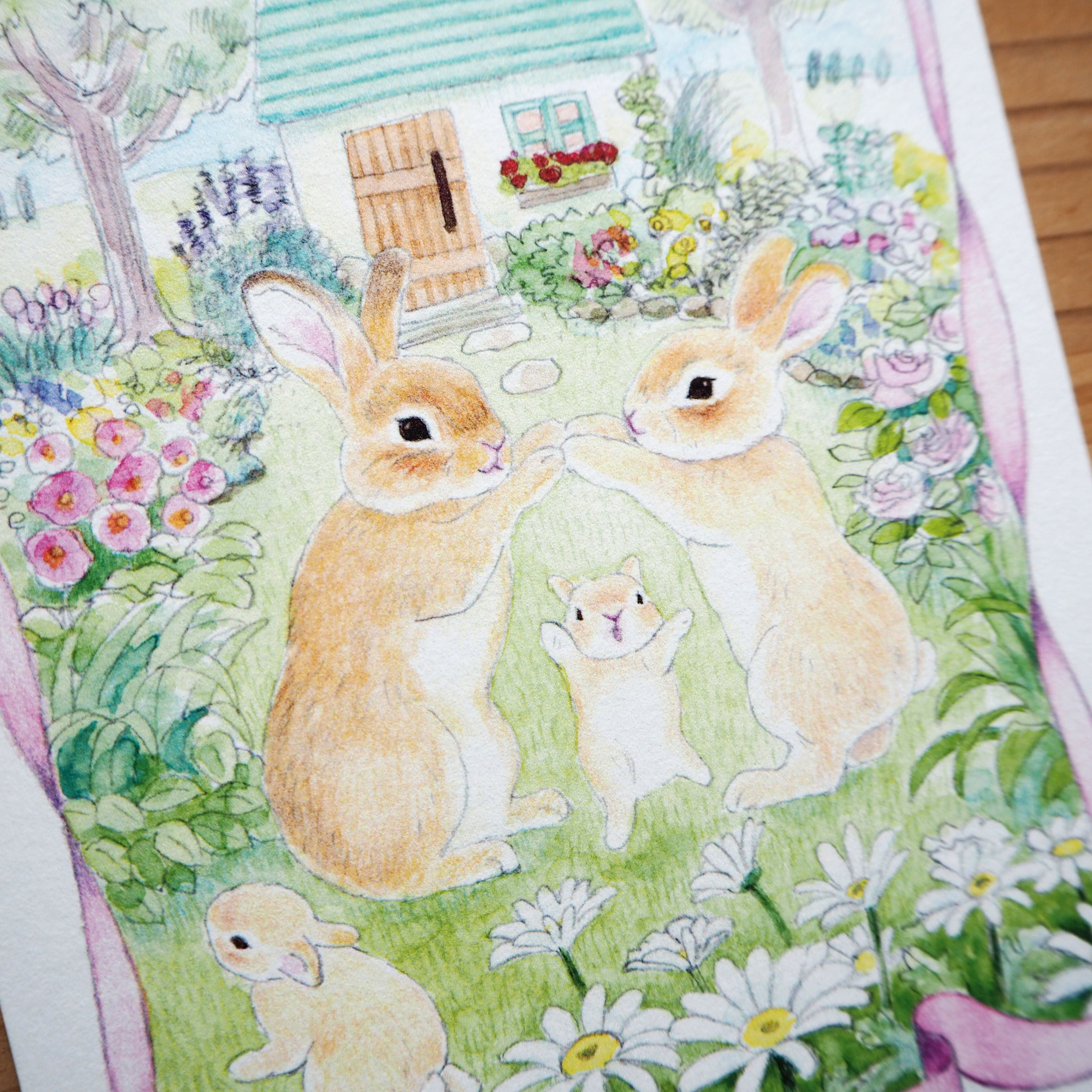 A4サイズのポスターとしてご好評いただいている作品を、 気軽に飾れるポストカードサイズのアートカードに仕立てました。 この絵は、ビートルズの Ob-La-Di, Ob-La-Da を聴きながら、 そこから浮かんだイメージをもとに描いたものです。 穏やかで幸せそうな、うさぎさん家族のひとときを表現しました。 うさぎモチーフが好きなお友達へのプレゼントに、 さりげなく気持ちを添える一枚としてもおすすめです。 素材:紙 サイズ:官製はがきサイズ(W100mm×H148mm) A4ポスターはこちら https://lulustore.thebase.in/items/74694623 ※本作と同じテーマで制作した銅版画作品も、iichiにて販売しています。 銅版画作品の販売ページはこちら https://www.iichi.com/listing/item/2438863 This art card is a postcard-sized edition of a popular A4 poster design, made for easy and casual display. The illustration was inspired by listening to Ob-La-Di, Ob-La-Da by The Beatles. It depicts a gentle and joyful moment shared by a happy rabbit family. It also makes a lovely addition to a gift for someone who loves rabbits, as a small card to quietly convey your feelings. Material: Paper Size: Postcard size (W100mm × H148mm) Please note: An etching work created with the same theme is also available on iichi.