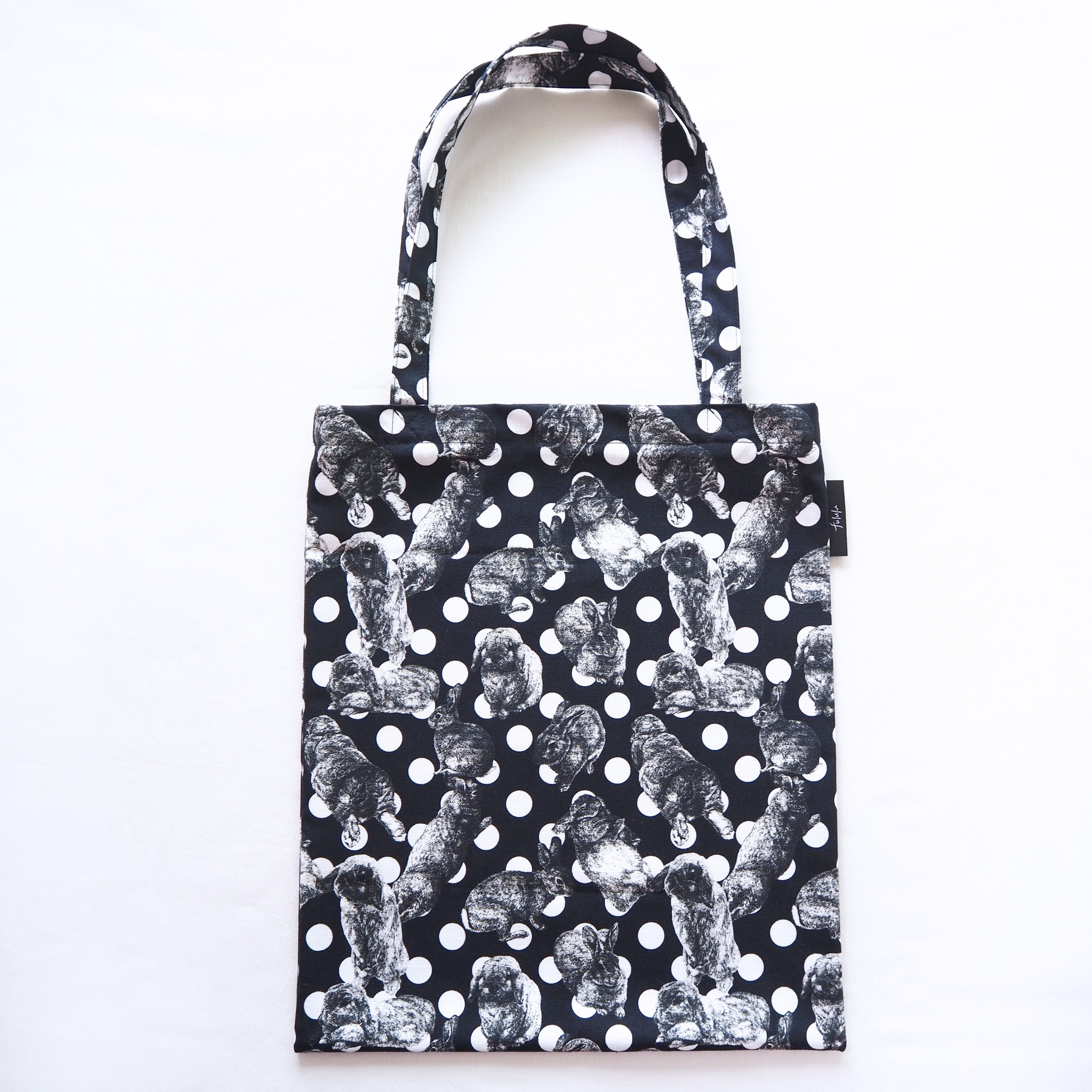 細いペンで描いたうさぎさんと水玉を組み合わせたオリジナルファブリックで作りました。