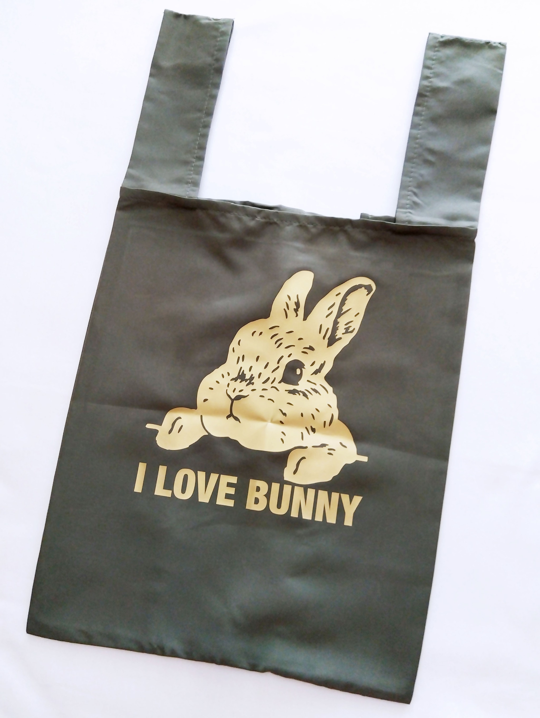 ベースは落ち着いたカーキ色のバッグに、ゴールドの立ち耳うさぎさんを大きくプリントしました。