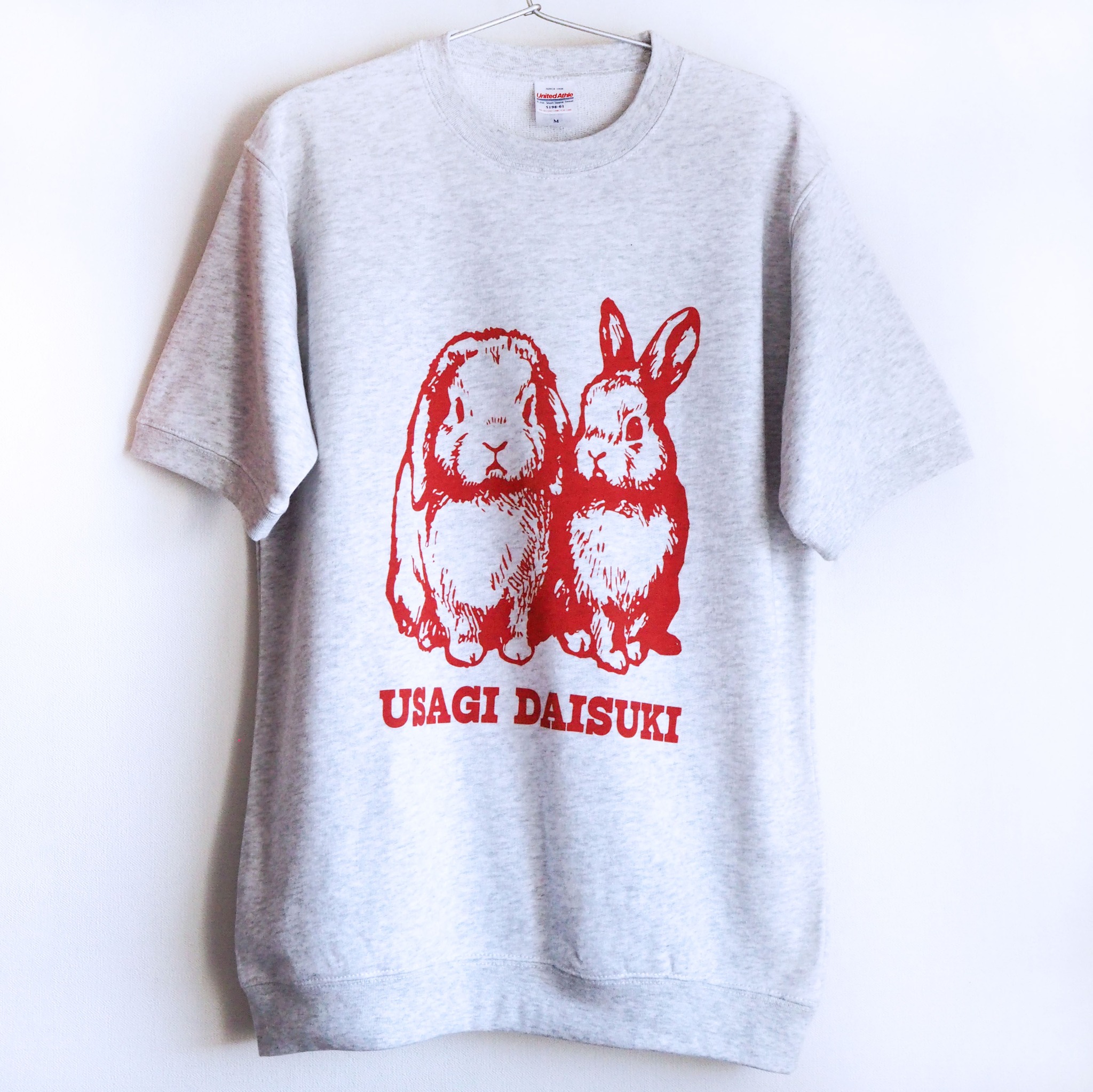 Tシャツだとちょっと寒い、という時に着られたらいいなと思って半袖トレーナーにうさぎさんをプリントしました。
