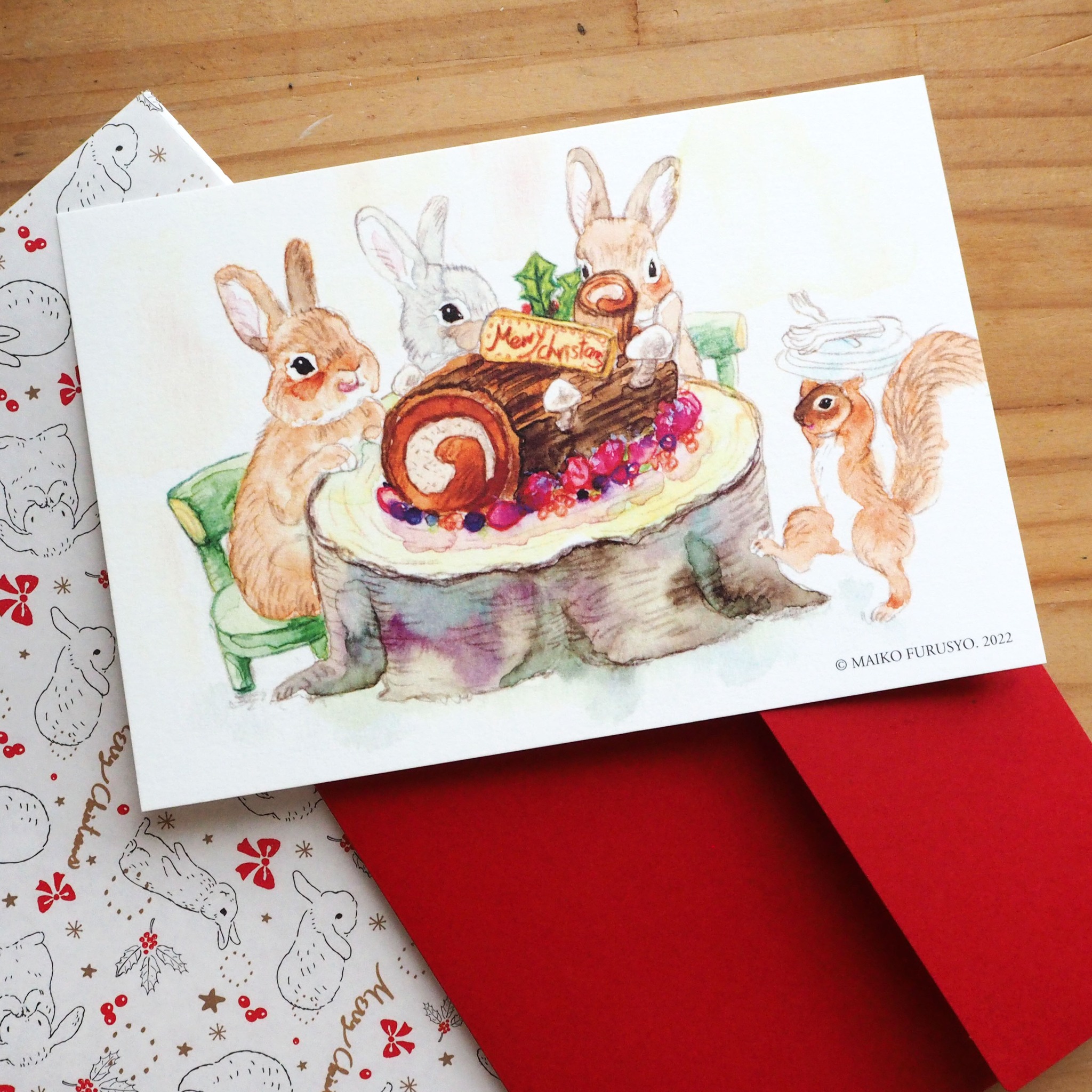 「ブッシュ・ド・ノエル」を囲むうさぎさんたちの絵です。
