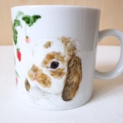 小ぶりなマグカップにうさぎさんと苺を直接、手で描きました。