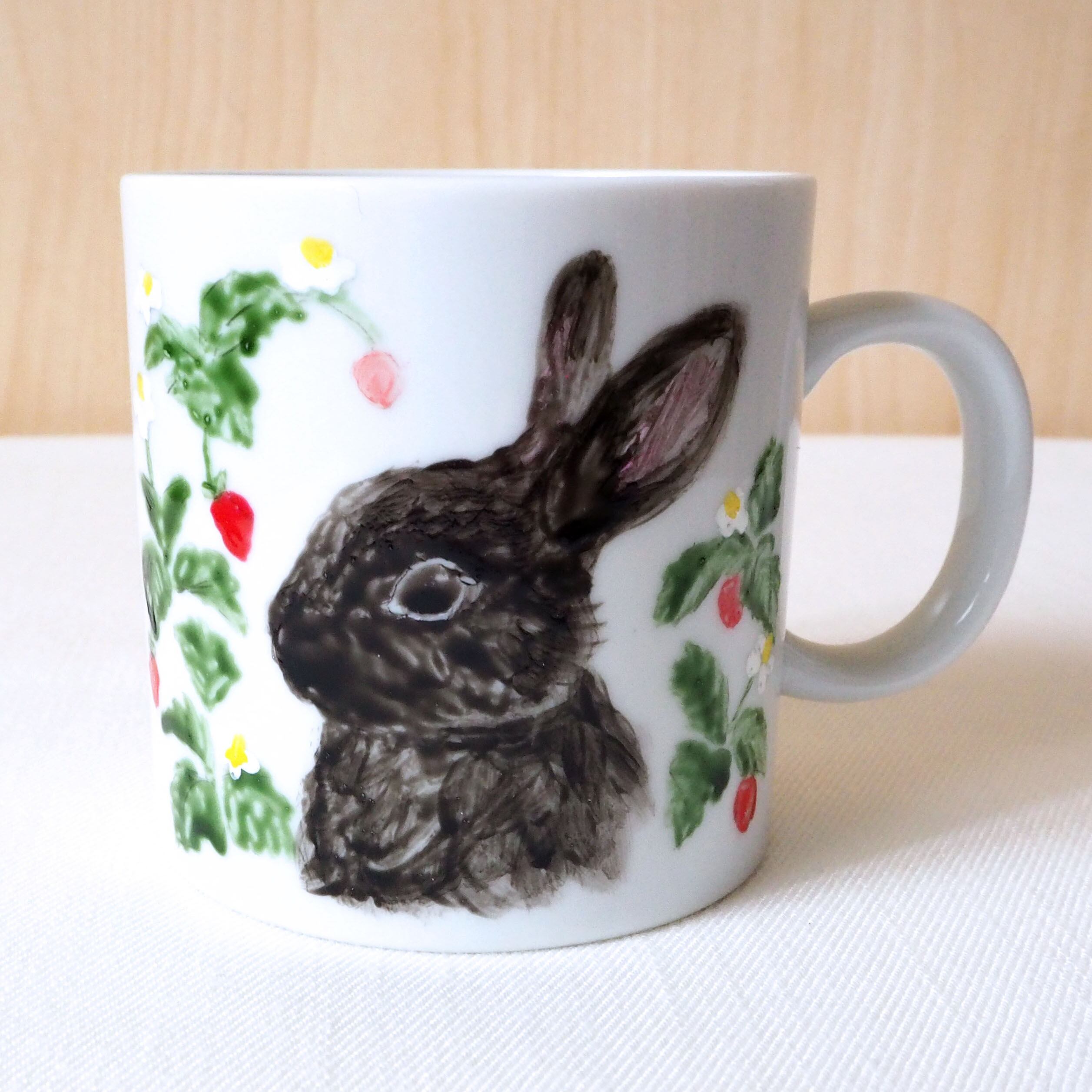 小ぶりなマグカップにうさぎさんと苺を直接、手で描きました。