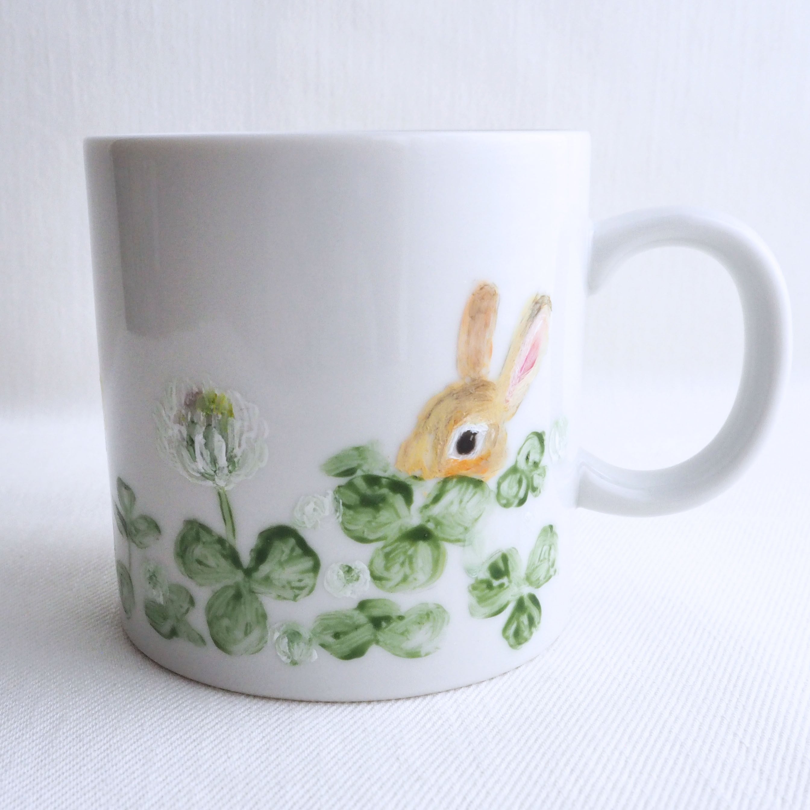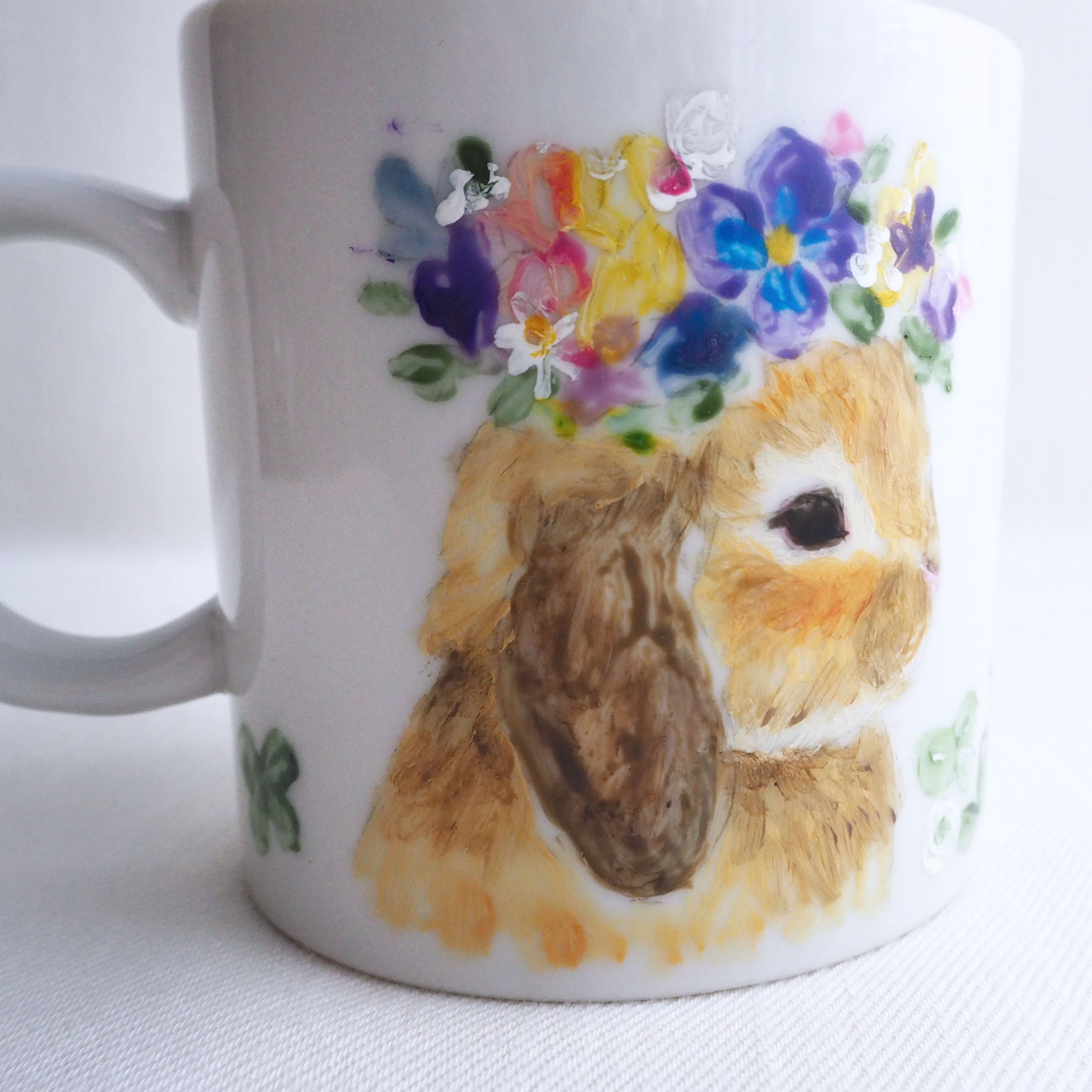 小さめサイズの陶器マグカップに、花冠をかぶったロップイヤーのうさぎさんを、筆で丁寧に手描きしました。