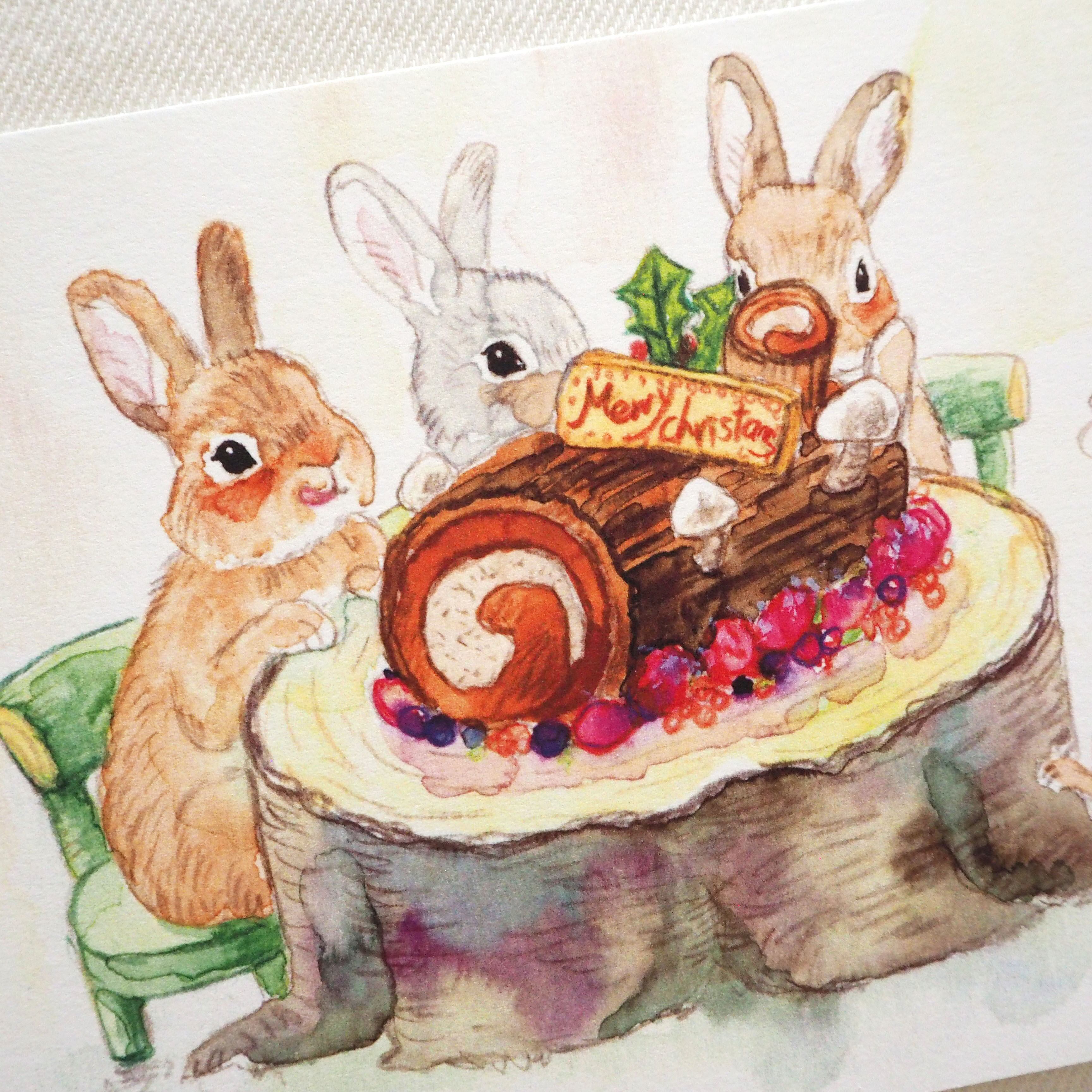 クリスマスケーキとしておなじみのブッシュ・ド・ノエルを食べようと集まったうさぎさんたち。