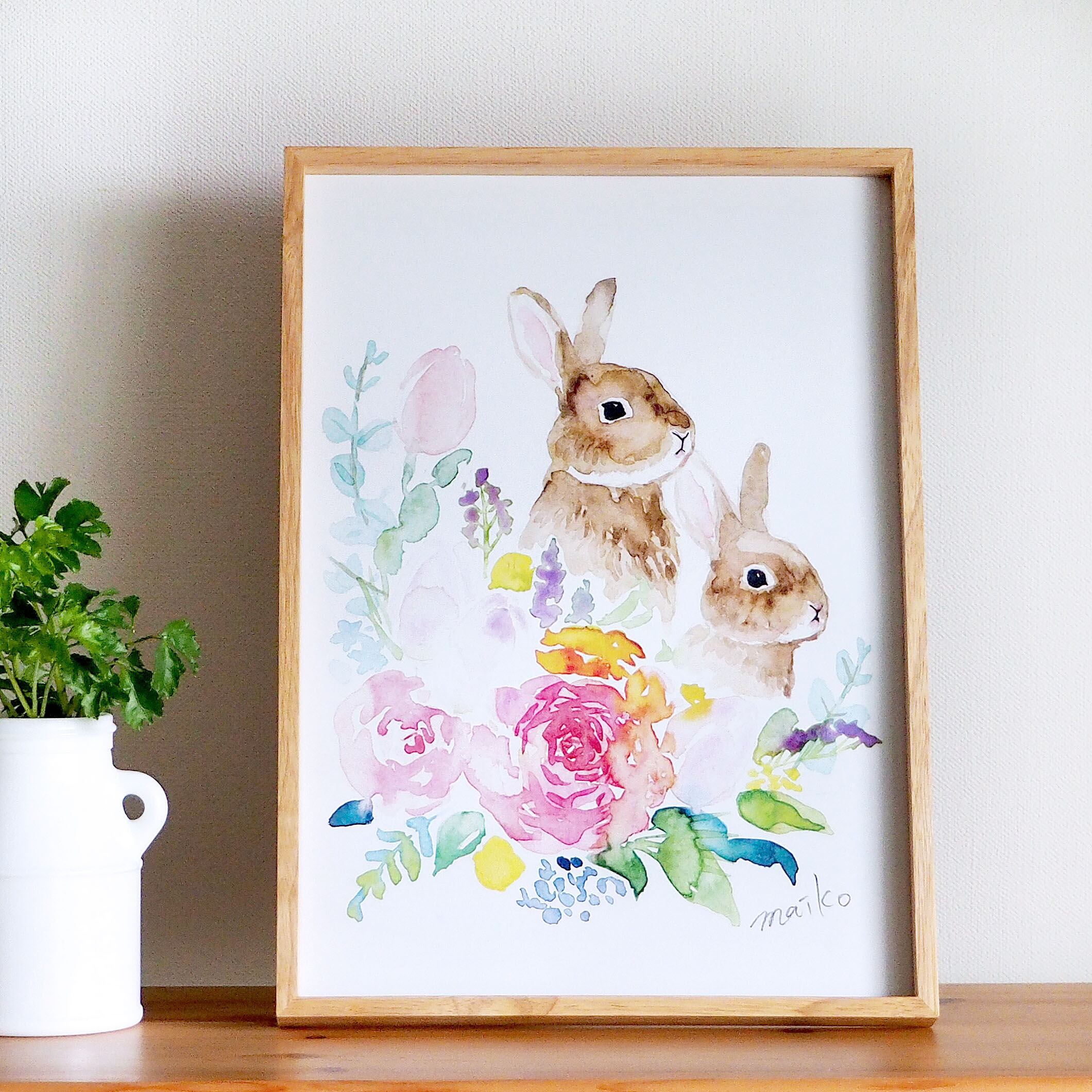 透明水彩絵の具で、ふんわり淡い色合いで描いた絵です。