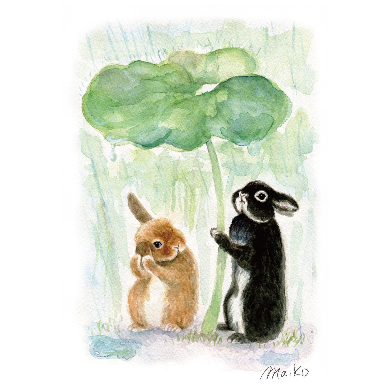 大きなフキの葉の下で雨宿りするうさぎさんたち。