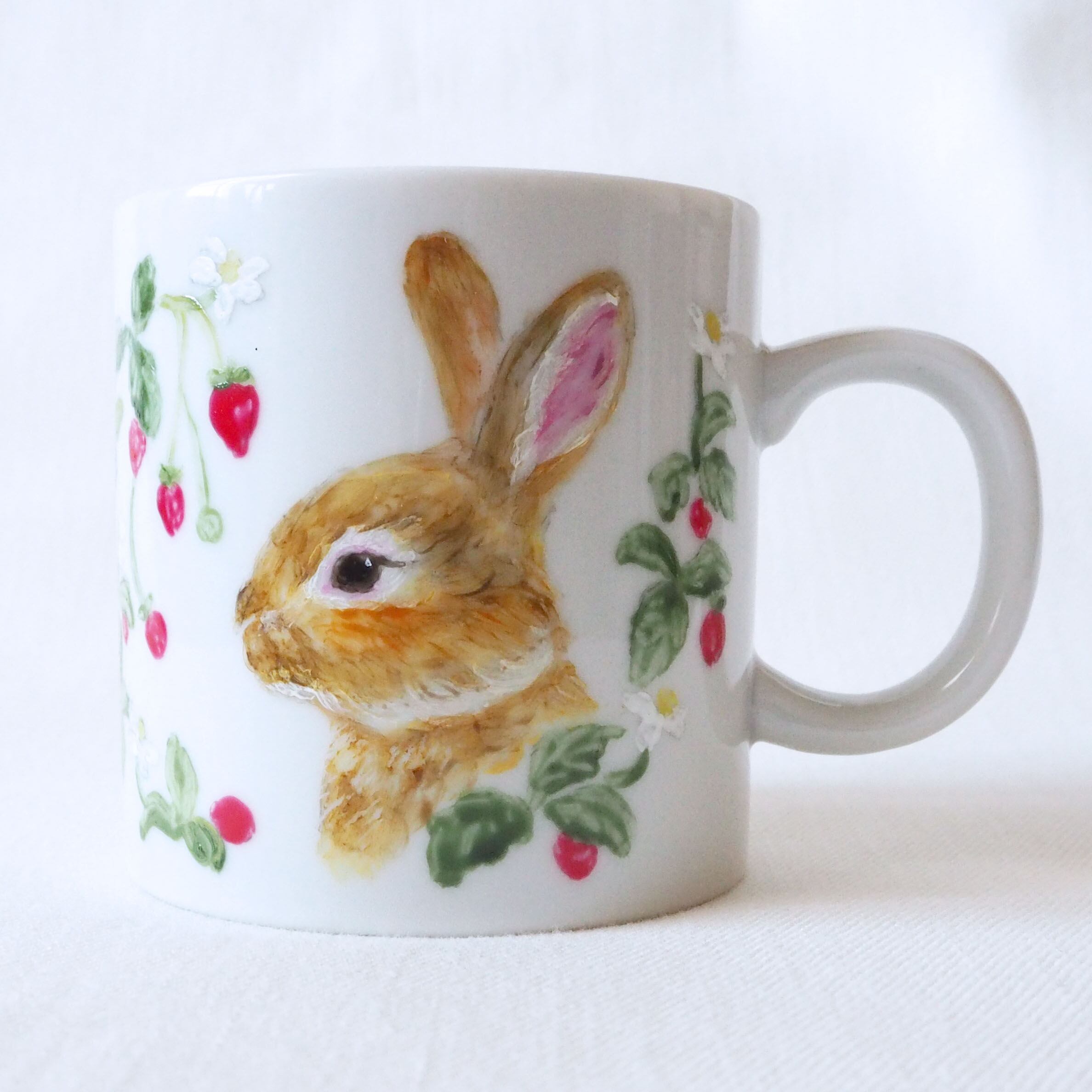 小ぶりなマグカップにうさぎさんと苺を直接、手で描きました。