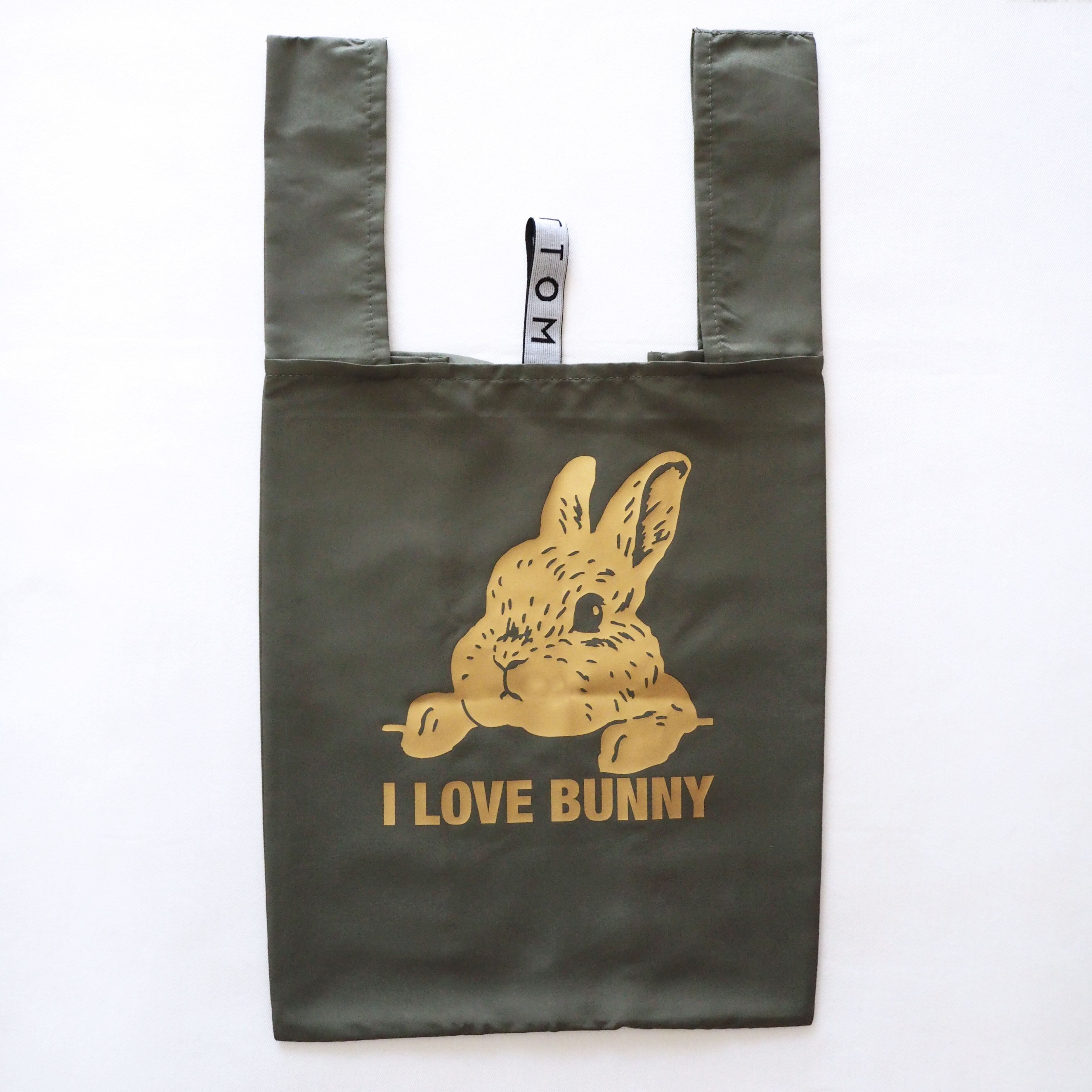 バッグ自体のカラーはカーキで落ち着いた雰囲気。真ん中に大きく華やかで上品な印象のゴールドのうさぎさんをプリントしました。大好きなうさぎさんがスパイシーで大人っぽいバッグになりました。